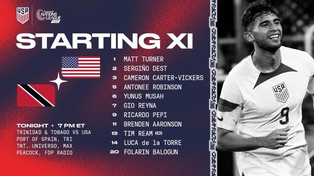 Tonight’s USMNT Starting XI at Trinidad and Tobago: 1-Matt Turner, 2-Sergiño Dest, 3-Cameron Carter-Vickers, 5-Antonee Robinson, 6-Yunus Musah, 7-Gio Reyna, 9-Ricardo Pepi, 11-Brenden Aaronson, 13-Tim Ream (Capt.), 14-Luca de la Torre, 20-Folarin Balogun