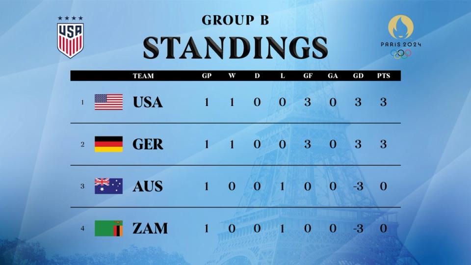The second group stage matchday features Australia-Zambia in Nice at 1 p.m. ET / 7 p.m. local followed by USA-Germany in Marseille. The Group B finale on July 31 features Germany vs. Zambia in Saint-Étienne kicking off simultaneously with USA-Australia in Marseille (1 p.m. ET / 7 p.m. local).